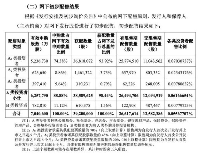 其中,公募基金、社保基金、养老金、年金基金、银行理财产品、保险资金、保险资产管理产品、合格境外投资者等A类投资者获配约3858.96万股,占网下最终发行比例的98.44%,私募、券商资管、券商自营等B类投资者获配1.56%,从具体获配股数来看,有的B类投资者最少只获配了31股。
