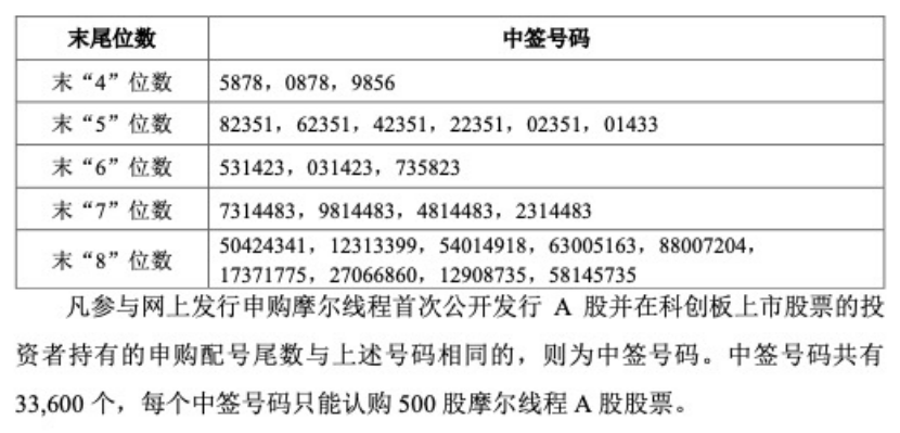 根据中签规则来看,摩尔线程的中签号码共有33600个,每个中签号码能认购500股摩尔线程A股股票,中一签需缴款57140元。
